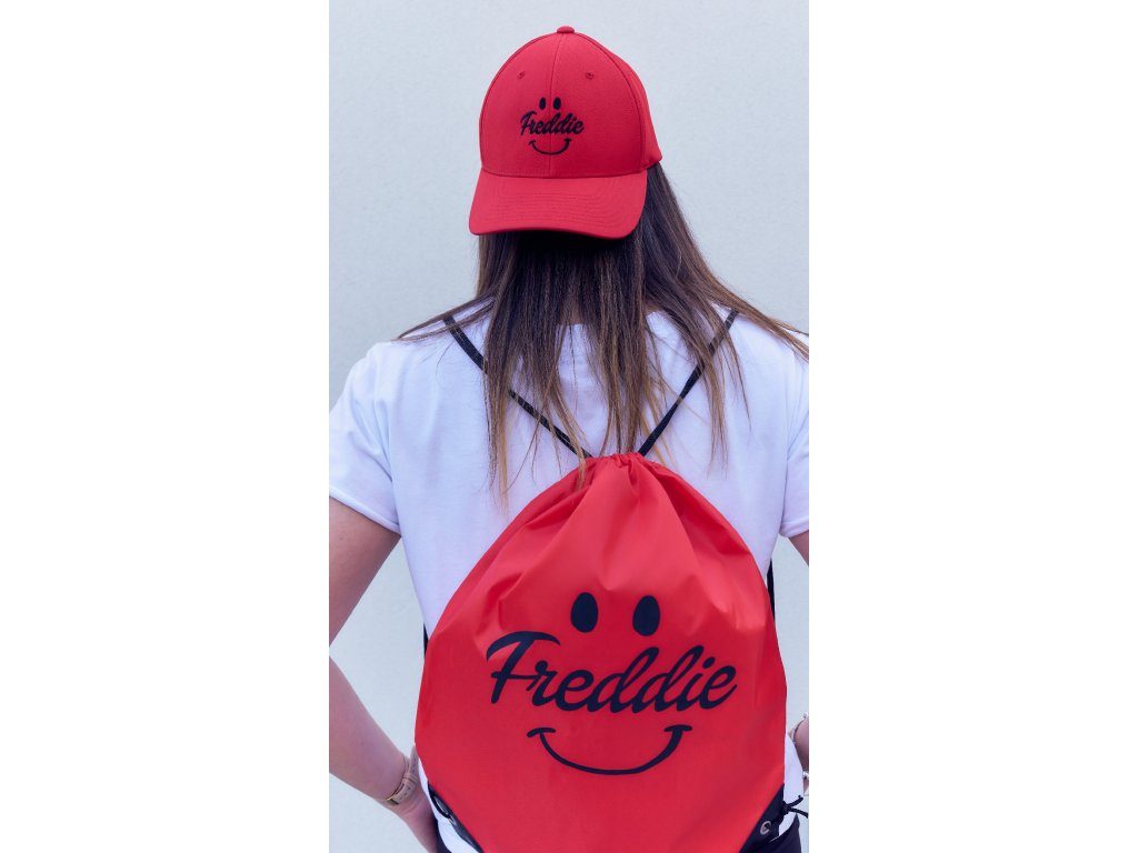 Červený sportovní vak na záda s černými prvky a s černým natisknutým logem FREDDIE.